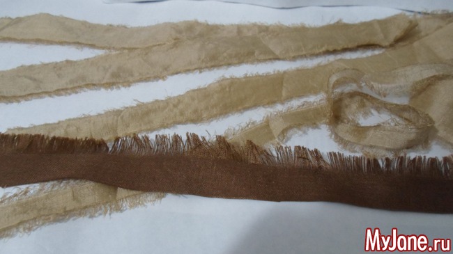 2. Отрываем от тканей песочных оттенков полоски разной ширины: от 2,5 до 1 см. Почему я решила именно отрывать ткань, а не отрезать ножницами? При отрывании край немножко заворачивается, образуя интересную фактуру, к тому же, оборванный край не так обсыпается впоследствии. Вдоль каждого оборванного края вытягиваем ещё несколько рядов ниток.