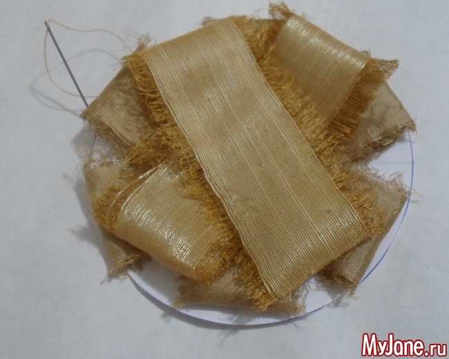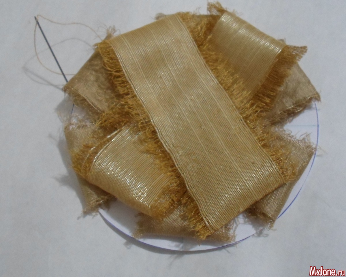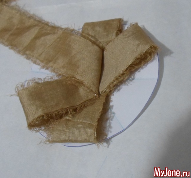 3. На шаблоне начинаем формировать брошь: сначала самые широкие полоски укладываем по направлениям, отмеченным на шаблоне. Потом – более узкие полоски, но размешаем их каждый раз между предыдущими полосками: то по линиям шаблона, то между линиями. Скрепляем все слои по центру иголкой или несколькими стежками.
