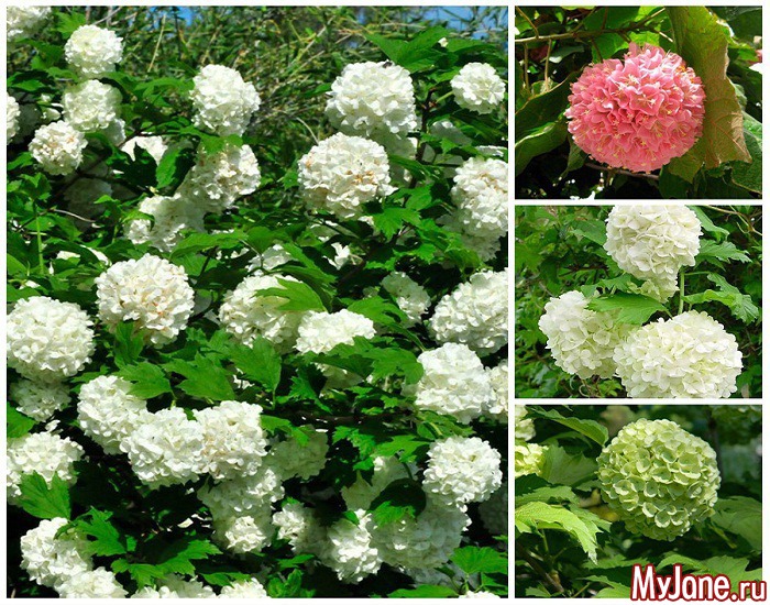 Свое название растение получило за крупные, до 10-15 см в диаметре, белые шаровидные соцветия со стерильными цветами, не дающими плодов, однако сейчас выведены разновидности бульденеж с другой окраской соцветия.