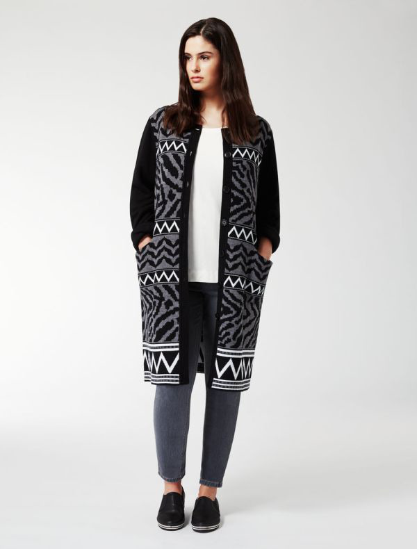 Сейчас на гребне волны находятся этнические мотивы. Этностиль все больше привлекает внимание покупателей. Он также нашел свое отражение в моделях пальто для полных фигур.Эффектное пальто из плотного трикотажа с ковровым узором. Черно-белая гамма всегда выглядит элегантно. Прямой силуэт и вертикальные планки застежки удлиняют рост и стройнят фигуру.