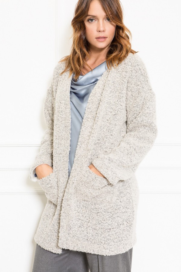 Это полупальто из буклированного трикотажа скорее напоминает кардиган. Его вполне можно носить в начале осени, когда погода еще не стала по-настоящему холодной.