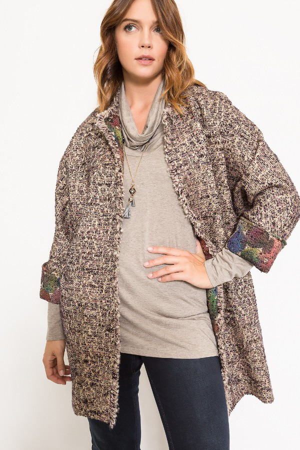 Еще один вариант пальто с использованием этностиля. Уютная модель, которую вы видите ниже, выполнена из ткани с ковровым узором, имитирующим фольклорное ткачество. Мягкая цветовая гамма и большой капюшон усиливают впечатление уюта. Застежка скрытая, как на многих сегодняшних моделях.