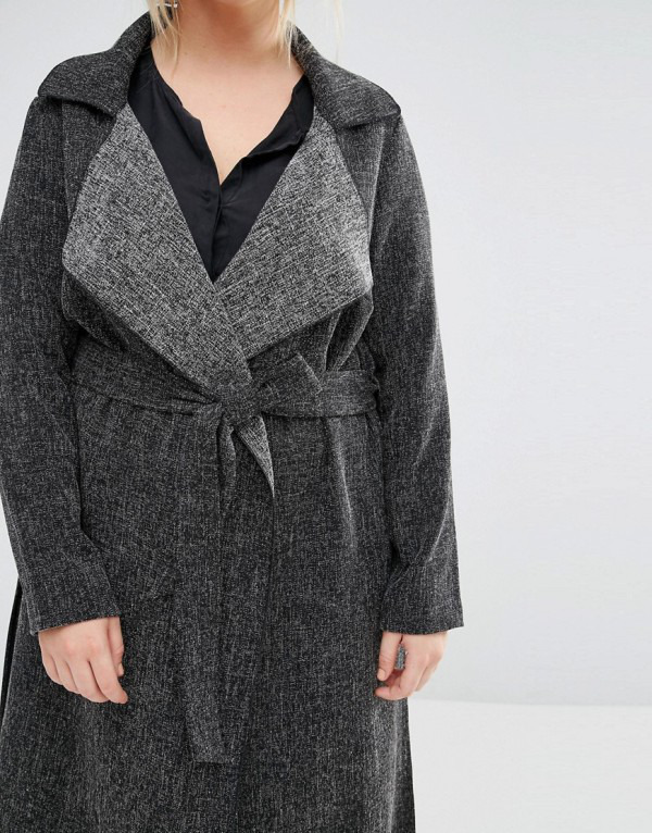 Модели с поясом не часто встречаются в ассортименте для полных фигур. Но пальто, которое вы видите ниже, выглядит вполне достойно. Такое впечатление создается благодаря красивому сочетанию тонов: графитового и светло-серого. Интересная деталь: большие лацканы.
