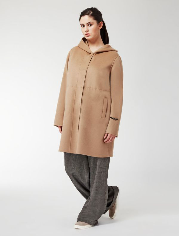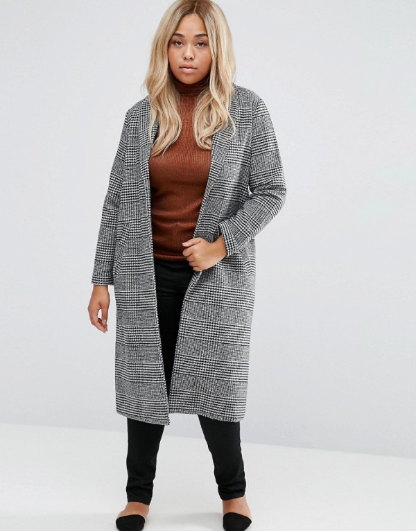 Отличное полупальто песочного цвета с капюшоном и застежкой, скрытой под планкой. Важный фактор – качественная, мягкая ткань с гладкой шелковистой поверхностью. Такие нюансы важны в одежде для полных фигур, именно они создают шик.Английская классика: пальто светло-серого цвета в графическую клетку (в мире моды она называется «виндзорская клетка» или «принц уэльский»).