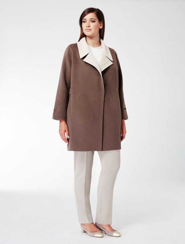 Пальто не имеет воротника, как и многие нынешние модели. Идеальным дополнением будет шарф-снуд в подходящей гамме.