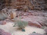 Есть в Вади-Рам и зелень – как она там растет, для меня, если честно, загадка. Яркую зеленую растительность можно повстречать и близ камней, и прямо на камнях!