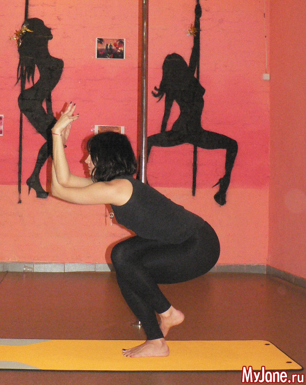 Для начала одну ногу обвейте вокруг другой и попробуйте присесть на опорной ноге. Держите положение пять дыхательных циклов. То же самое проделайте, сменив опорную ногу.