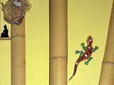Дальше пришла идея дополнить стену еще четырьмя фрагментами бамбука разного размера и на разном расстоянии. Их я просто приклеила к стене. И тут, глядя на свою композицию, вспомнила о прекрасной Шри-Ланке, именно что-то подобное из настоящего бамбука я увидела как только прилетела в эту страну. Это ощущение умиротворения решила закрепить, украсив наш «уголок тепла» привезенными сувенирами. Маска Гиниджал Ракша изображает демона с красными языками пламени вместо волос. Этот талисман притягивает энергию денег, направляет на удачный бизнес. Слоник из черного дерева с поднятым хоботом приносит уверенность. Фигурка Будды – символ страны с множеством прекрасных храмов, где много яркого света и великолепие лотоса, где растет легендарное дерево Бодхи, исцеляющее от всех болезней. А картинка на шелке переносит в небольшую мастерскую, где женщины вручную ткут, красят полотна натуральными красителями, а затем и вышивают всю эту красоту.