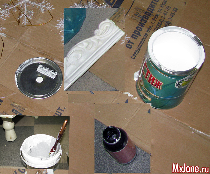 Декоративное украшение можно купить из пластика, это более практичный вариант, но в нашем случае подойдет и плинтус из пенопласта, так как ежедневно пользоваться ею не предполагается, это деталь витражного интерьера. С помощью клея фиксируем сверху и снизу. Края срезаем под углом, чтобы конец плинтуса не выступал, и красить его серым грунтом не надо.
