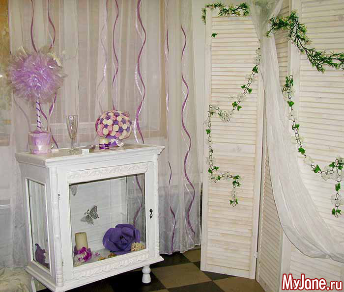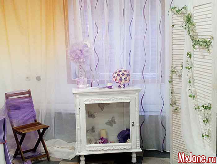 Смываем со стекла следы краски, и можно приступать к декорированию. Вариантов много, можно внутри витрины приклеить обои или бумагу в мелкий цветочек, или сделать декупаж, или, как в нашем случае, приклеить бабочек.