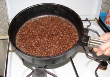 Для начала кофейные зерна следует обжарить на сковороде. Верным признаком того, что они хорошо прожарились, будет служить характерный звук потрескивания, а сами зерна станут словно маслянистыми.