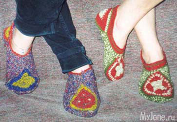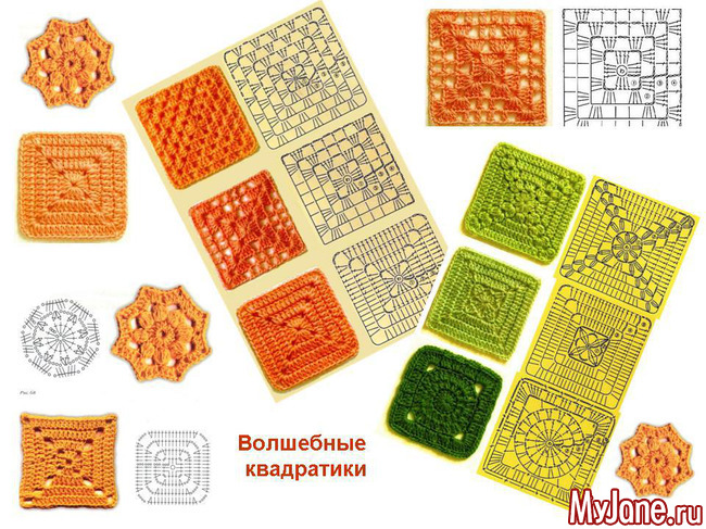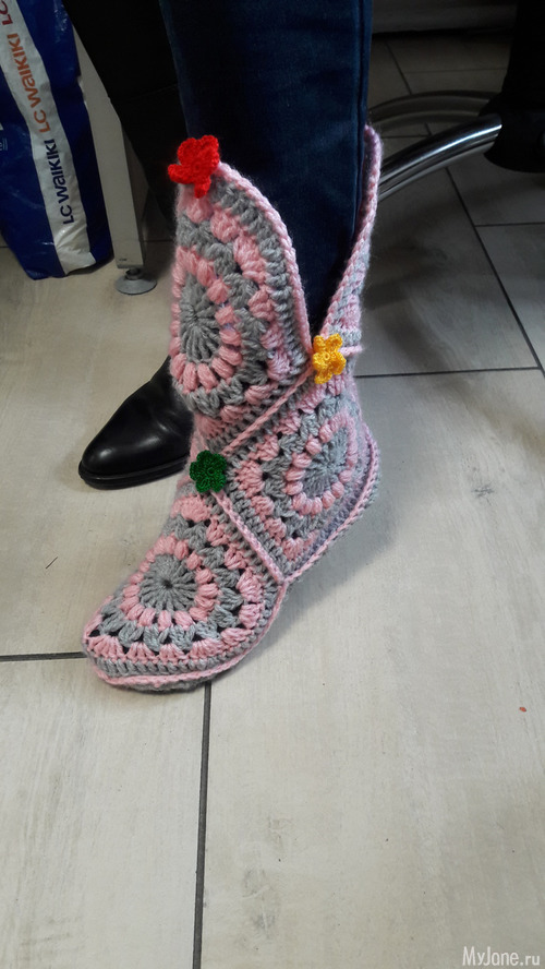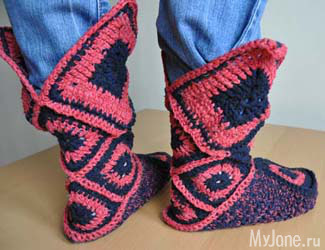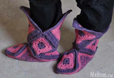 В статье "Тапочки из квадратов" https://www.myjane.ru/articles/text/?id=7754 подробно описано изготовление различных квадратов и сборка из них различных вариантов - от шлепанцев до сапожек