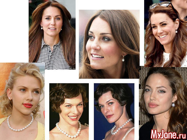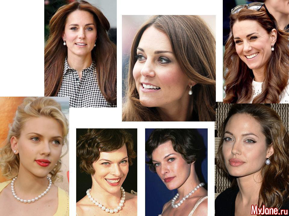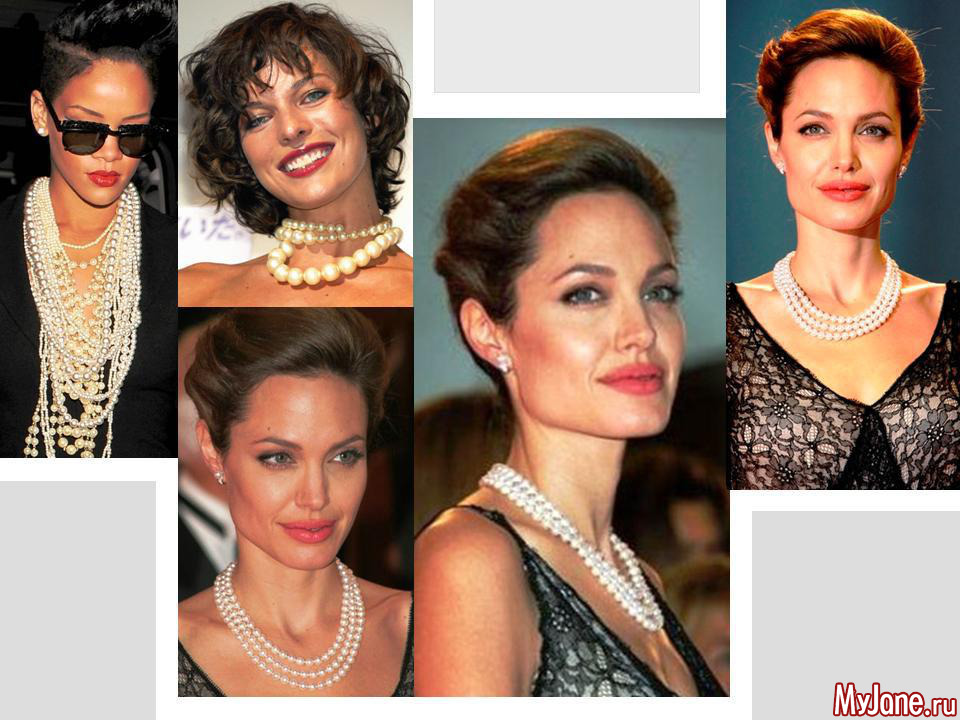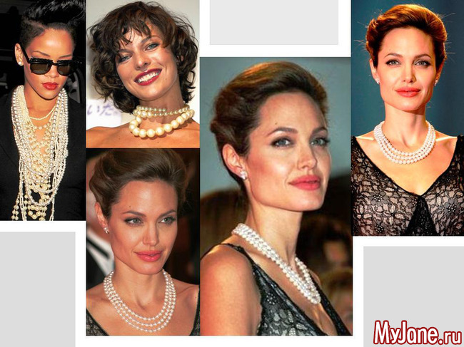 Знаменитости тоже с удовольствием носят жемчуг. Анджелина Джоли обладает безупречным классическим вкусом, поэтому она всегда выглядит достойно и элегантно. Здесь на ней надето ожерелье из трех ниток жемчуга плюс скромные серьги.