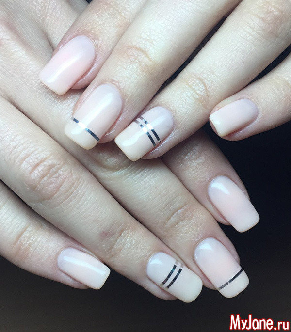 К слову о «лунном» маникюре. Он актуален не меньше «фрэнча»! «Лунную улыбку» модно делать как цветной, так и прозрачной и выделять даже несколькими линиями.