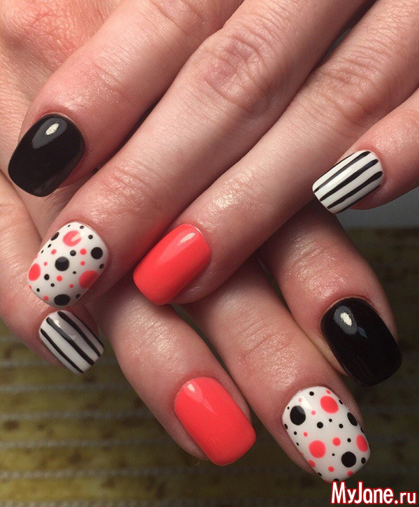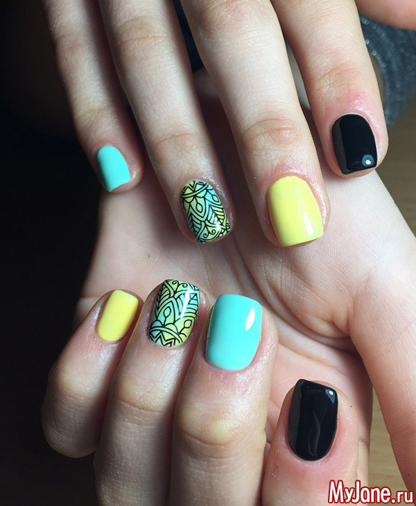 Любители яркого покрытия для ногтей этой весной также могут не отказывать себе в удовольствии. Модно даже дерзко покрыть все ногтевые пластины по-разному. Откровенно яркие цвета можно контрастно отделить на одном из пальцев черным покрытием, на отдельных ногтевых пластинах можно нарисовать цветные кружочки, полосы или орнаменты. В палитре используемых основных цветов отдавайте предпочтение модным лимонному, апельсиновому, мятному, розовому, бирюзовому, синему, изумрудному, красному, винному и т.п.