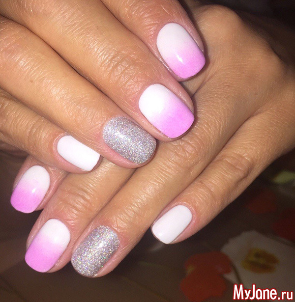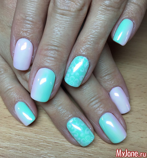 Отличное решение для весны в ногтевом покрытии – омбре. Едва заметное горизонтальное или вертикальное перетекание одного цвета в другой на одной ногтевой пластине выглядит очень необычно и выигрышно. Достигается такой эффект либо с помощью кисточки, которой выполняется растяжка цвета, либо с помощью аэрографа – специального небольшого ручного распылителя. Эти техники позволяют сделать плавный переход между двумя даже довольно контрастными цветами.