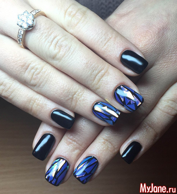 Еще один эффектный тренд в покрытии ногтевой пластины – «битое стекло». Эффект раскрошенных по ногтю осколков стекла достигается с помощью фольги или слюды.