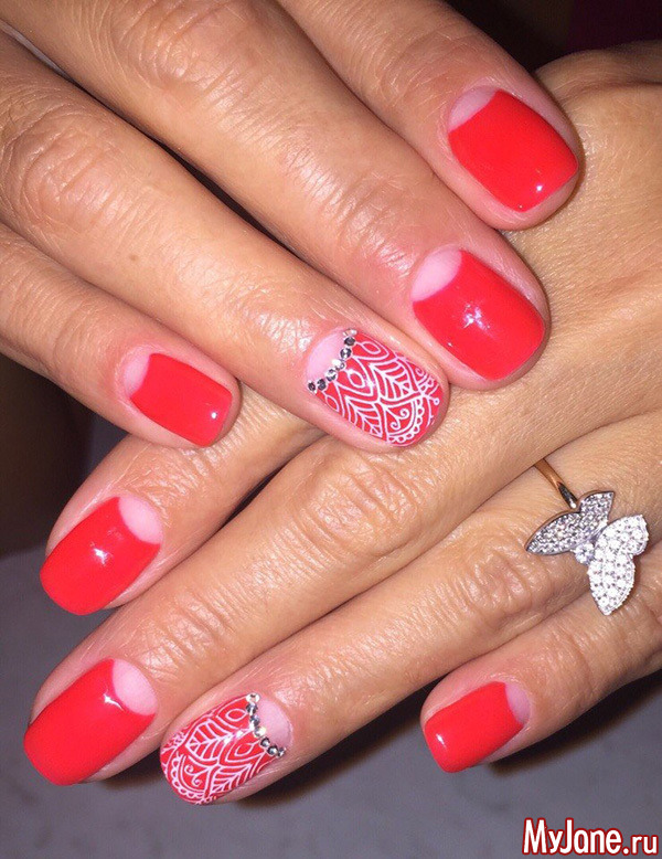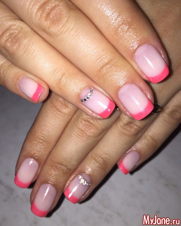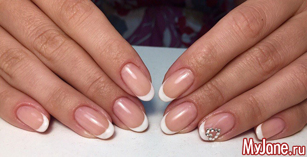 И, конечно же, никто не отменял вечную классику – «французский» маникюр. Выбор цвета «улыбки» демократичный: от классического белого до цветного. Особого шика и нарядности «фрэнчу» можно добавить с помощью узора из миниатюрных камушков на одной ногтевой пластине.