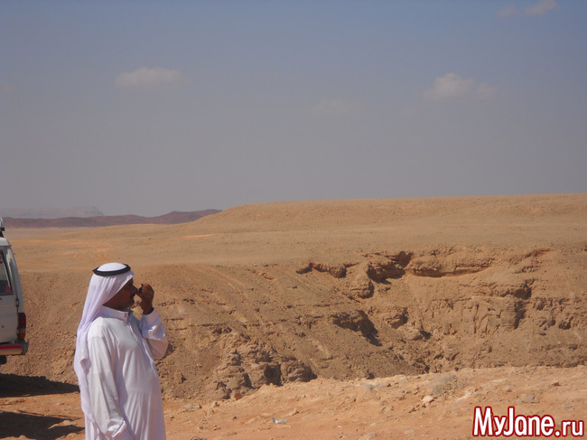 Что касается нас, то мы продолжили свое восхождение на вершину плато. Кстати, это именно то плато, с которого открываются прекрасные виды на Саудовскую Аравию, Иорданию и Израиль! И здесь можно сделать удачные кадры не только с чудесными природными видами, но и с людьми! Видимо, этот египтянин основательно задумался о чем-то великом и важном, потому что он простоял с застывшим пальцем в носу несколько минут! Кстати, посещая пустыню, мне все время хочется спросить местных жителей, чем они стирают свою одежду, и как им удается сохранять ее до такой степени белоснежной. И все время не решаюсь… Надо будет в следующий раз все-таки исправить эту недоработку!