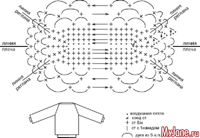 Начало работы – цепочка из воздушных петель длиной 58-62 см. Отметить середину цепочки, замкнуть ее в круг, получилась горловина блузона. Середина и начало/конец цепочки – линии плеча. На набранной цепочке вязать (в каждую петлю) по кругу столбиками без накида горловину – лодочку, прибавлять по 1 столбику справа и слева от каждой линии плеча (4 прибавки в каждом ряду), до высоты полотна 4 см. Завершить плотную часть соединительным столбиком. 1-ый ажурный ряд вязать по всей горловине дугами из 5 в.п., прикрепляя их столбиками б/н на переде и спинке через 2 столбика, на плечах связать 4 дуги без пропусков (смотри схему). Далее вязать ажурное полотно лицевыми и изнаночными рядами (в конце каждого ряда поворачивать работу), столбики б/н вязать, вводя крючок под дугу. Наметить линии реглана, на которых выполнять прибавления. Каждый ряд заканчивать составной дугой из 3 в.п. и 1 ст. с 1Н. В процессе вязания необходимо примерять получившуюся работу. Довязав до необходимого размера (48 см по ширине переда/спинки для 44 размера) пропустить дуги рукавов, связав ряд объединяющий спинку и перед. Далее вязать блузон без боковых швов одинаковыми рядами до желаемой длины. Для оформления низа связать 1 ряд дугами из 3 в.п. и несколько рядов (4 см) столбиками б/н. На оставленных отверстиях довязать по кругу рукава. Для оформления манжеты связать 1 ряд дугами из 2 в.п. и несколько рядов (4 см) столбиками б/н.