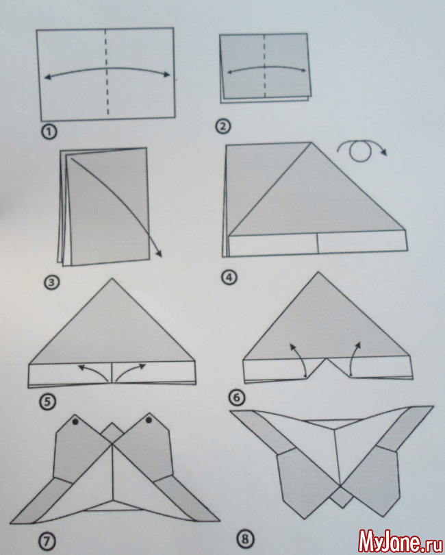 На фото изображена схема – подсказка всех этапов складывания бабочки-оригами.