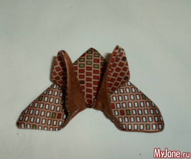 8. Отворачиваем правый уголок влево, переворачиваем на другую сторону и тоже отворачиваем уголок. Должна получиться конструкция, как показано на следующем фото.