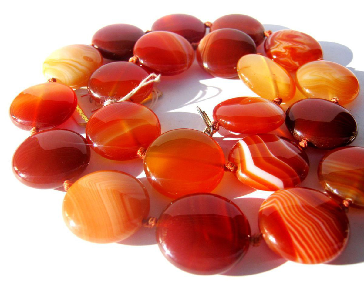 Красные сердолики улучшают кровообращение и избавляют от головной боли, а жёлтые улучшают работу желудочно-кишечного тракта. Бусы из сердолика носят при заболеваниях щитовидной железы.