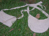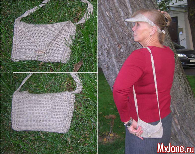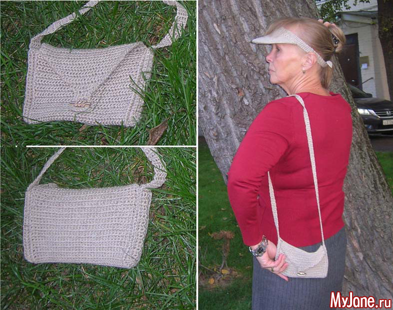 Из льняных ниток, оставшихся после изготовления Пончо «Ната», связаны козырек и маленькая сумочка на длинном ремешке.