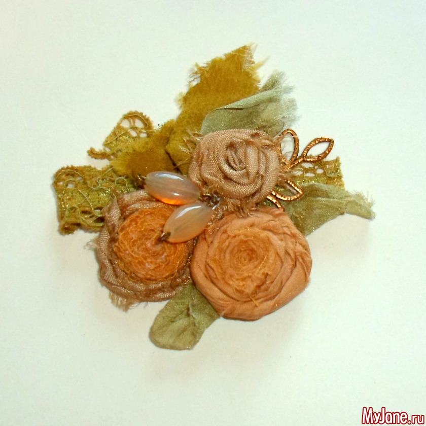 Две следующие броши совсем маленькие, до 4 см. Вот так выглядит брошь из тончайшего "жатого" шелка и маленького листика из металла.