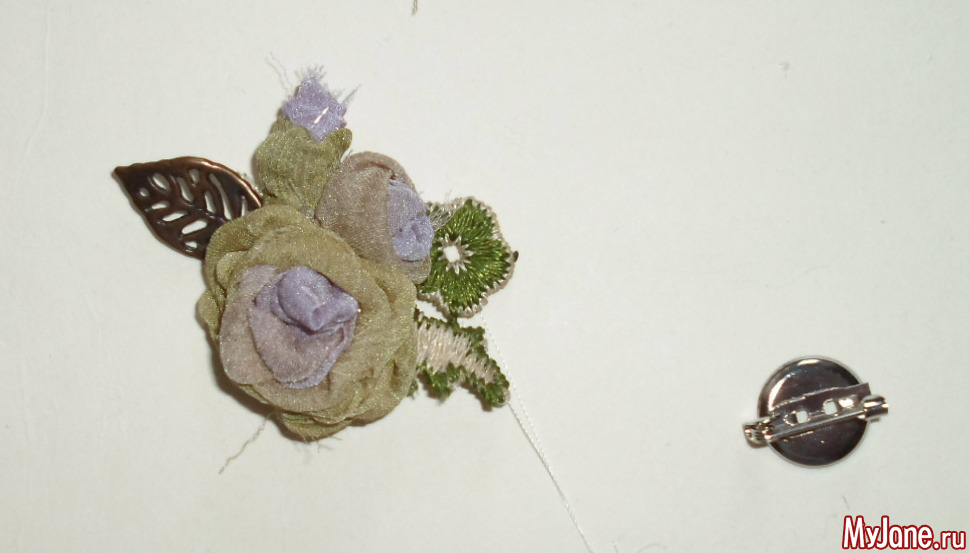 Добавляем немного кружева рядом с листьями. С изнанки прикрепляем застежку. Вот такая брошь получилась, её диаметр примерно 5,5-6 см.