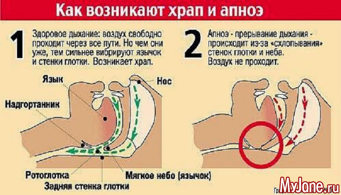 - обструктивное апноэ, вызванное нарушением нормальной циркуляции воздуха в верхних дыхательных путях;