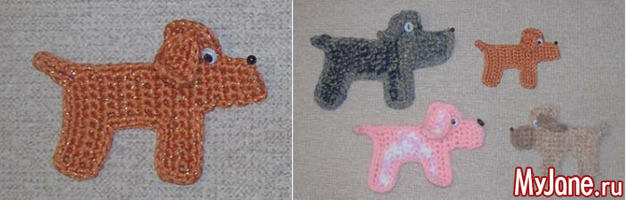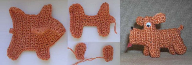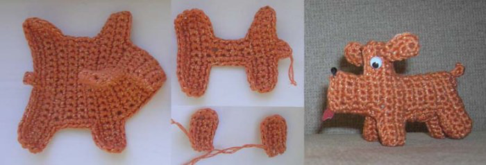 Объемная собачка немного сложнее, для нее необходимо связать по схемам простенькое брюшко, два уха и деталь ноги-спинка-голова. Затем пришить уши, соединить брюшко со спинкой (пришить или привязать СБН), одновременно выполняя набивку игрушки.
