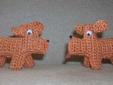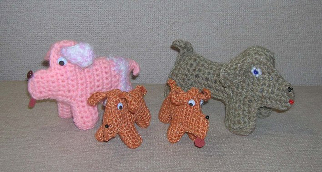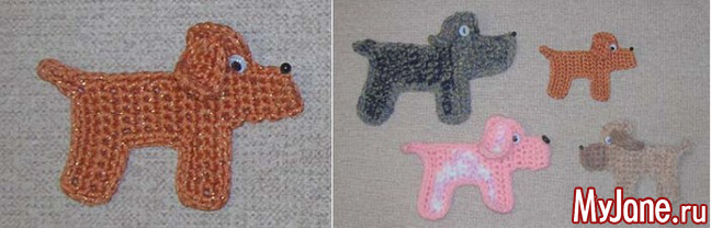 Готовимся к Новому Году – Году Желтой Земляной Собаки. В Сети можно найти игрушки самой разной формы/материала/сложности. Повторить моих собачек (и сделать их много-много за разумное время) по силам даже не очень умелым рукодельницам, достаточно уметь вязать воздушные петли, столбики без накида и держать в руках иголку с ниткой.
