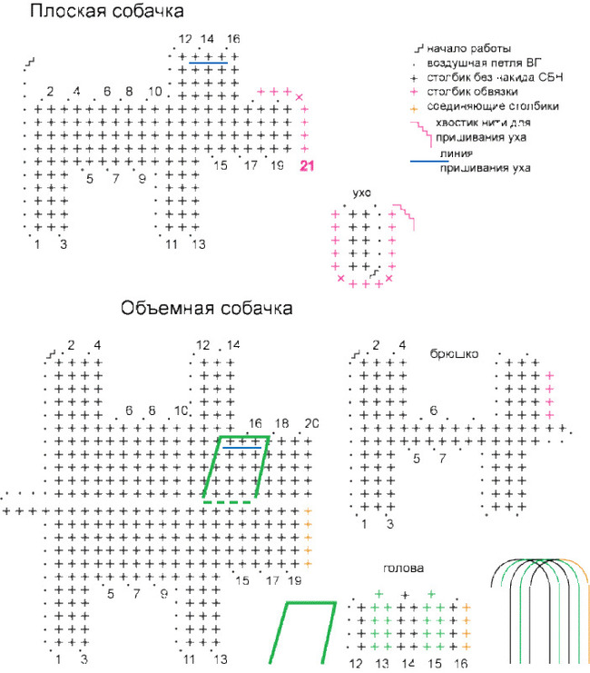 Для плоской собачки набрать 14 ВП (высота 7 см, крючок 2.0 – терракотовая, высота 10 см, крючок 3,5 – розовая), связать на них 10 СБН (1 ряд), 1 ВП подъема, повернуть работу, 10 СБН (2 ряд), далее по схеме. После 5СБН 10-го ряда связать 6 ВП для ноги, в конце 11 ряда довязать 5 ВП для головы. После 20-го ряда повернуть работу без ВП подъема, выполнить обвязку всей собачки по контуру СБН (на схеме розовым цветом, ряд 21, показано начало обвязки мордочки) делая необходимые прибавления на внешних уголках. На 6ВП связать СБН два ряда уха, обвязать деталь по контуру и пришить (по синей линии на схеме) ухо к голове. Сделать плоской (отпарить) основную деталь, ухо можно оставить как получилось.
