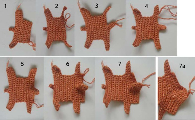 Для выполнения детали ноги-спинка-голова необходимо набрать 15ВП, связать на цепочке 4СБН для хвоста, довязать цепочку из 11ВП для второй ноги. Продолжить работу навязывая поворотными рядами из СБН задние ноги (ряды 1-3). В 4-м ряду вязать СБН только на одной ноге, затем укоротить ряд формируя брюшко (ряды 5-9, фото 1). 10-й ряд, а затем и 11-й удлинить на 6ВП для вязания передних ног (фото 2). В 12-м ряду провязать 11 СБН (до середины спинки), набрать 5ВП для головы (зеленый контур и отдельная схема), вернуться по ним 4СБН (5. и 4+,фото 3), продолжить вязание до низа ноги – еще 11 СБН (фото 4). В 13-м ряду вязать 11 СБН по телу, 9СБН (зеленые + на схеме головы) по выступающей голове, затем 11 СБН по телу (фото 5). Продолжить вязание по схеме навязывая голову и мордочку (фото 6). В 16-м ряду провязать половину столбиков головы (фото 7 и 7а), 1ВП,