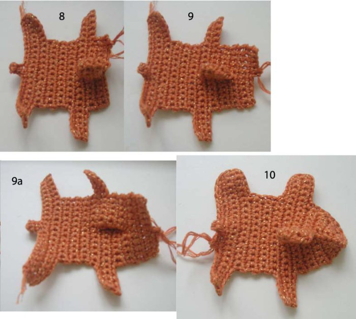 сложить деталь, провязать 4СБН соединяющие половинки головы (желтые + и линия на схеме головы, фото 8). Продолжить работу по схеме довязывая мордочку (фото 9 лицо детали, 9а-изнанка). Обвязать деталь СБН по контуру (фото 10).