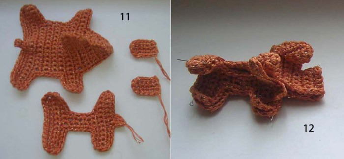 Связать по схемам и обвязать брюшко и два уха (все детали перед соединением на фото 11). Пришить уши к голове. Присоединить брюшко к туловищу булавками (фото 12).