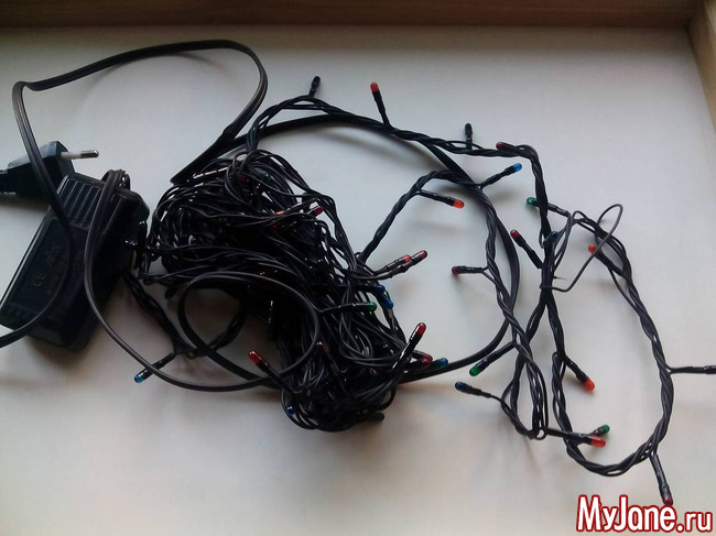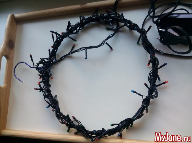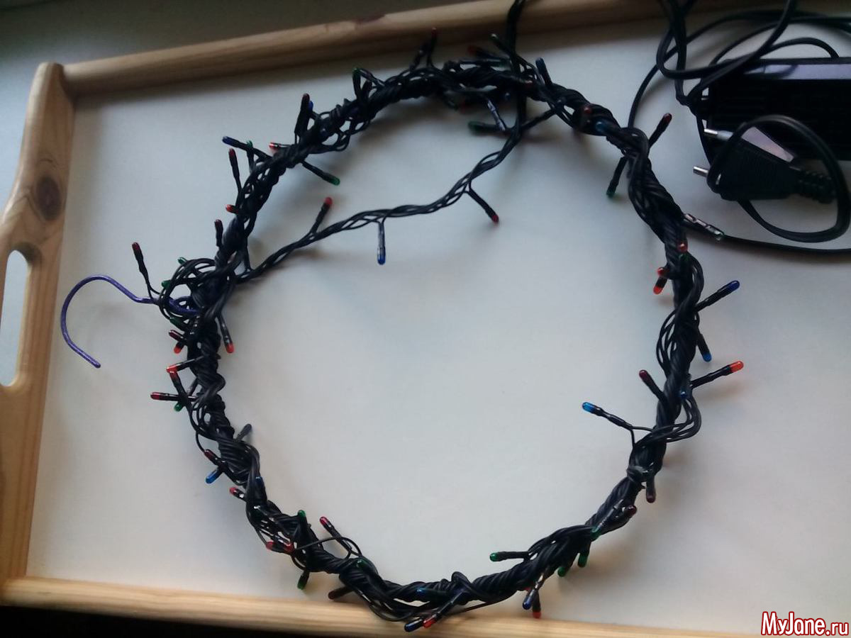 а битыми, хорошо измельчив их, украсить ленту. Но я решила сделать сверкающий веночек, использовать гирлянду из лампочек.