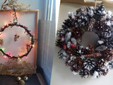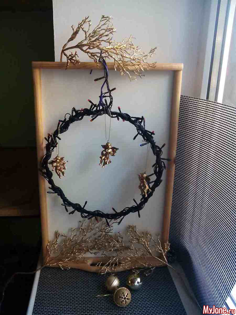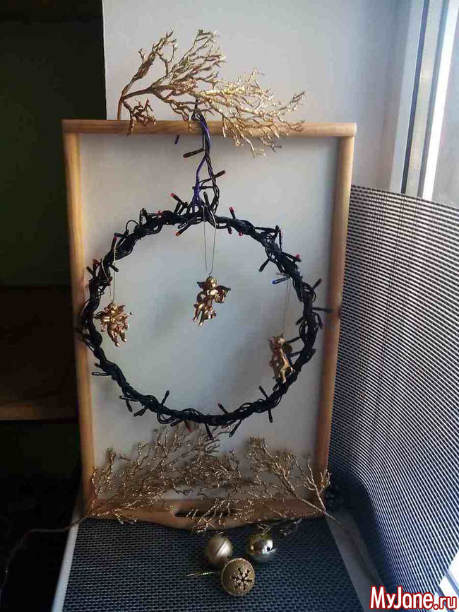 Усики с лампочками расположила в разные стороны для эффекта маленьких веточек. Дошла до петельки, прикрыла и ее гирляндой, а сантиметров 50 оставила для свободного подключения к сети. Готово. Теперь можно добавить ярких деталей. У меня это три прекрасных ангелочка.