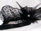 Отмеряем необходимую длину эластичной тесьмы (на несколько см меньше обхвата головы) и сшиваем её в кольцо. С обратной стороны композиции прикрепляем тюль в черный горох таким образом, чтоб он поддерживал страусиное перо и одновременно играл декоративную роль.
