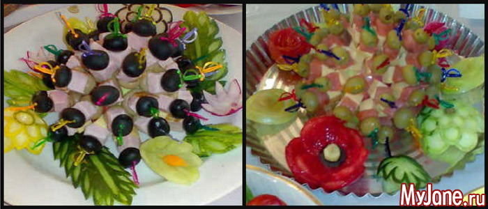 Канапе с одинаковой начинкой рекомендуется класть по диагонали, такое оформление смотрится очень эффектно.