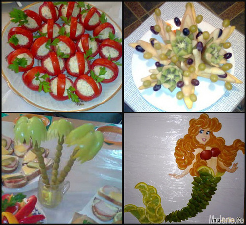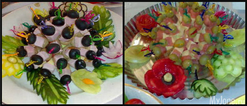 Сложно без привычки, пока не знаешь точно, что и как делать, и рука "не набита". А если чуть потренироваться, вырезается очень быстро. Такие "листики" из огурцов или кабачков можно даже закрывать на зиму в маринаде! ![]() На фотографии - фрагмент декора праздничного юбилейного стола у отца на работе, все "украшалки" вырезала я одна накануне простым кухонным ножом и оставила на ночь в холодильнике, в контейнере с ледяной водой, на все про все часа два, не больше. Утром осталось лишь обсушить и разложить по тарелкам!))) Если нравится карвинг, можете глянуть здесь - https://www.myjane.ru/articles/text/?id=16726 , все работы на фото мои. |