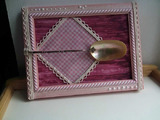Старую рамку для фотографий я возьму за основу композиции. Ее я слегка тонировала бело-розовой краской. Просто по верху поверхности прошлась небрежно сухой кисточкой, окуная ее предварительно в смесь красок. После того, как рамка высохла, отсыпала сухую серебряную краску и губкой нанесла тонкий слой поверх окрашенной поверхности. Получается легкий налет серебра, что перекликается с переливом самой ложки.