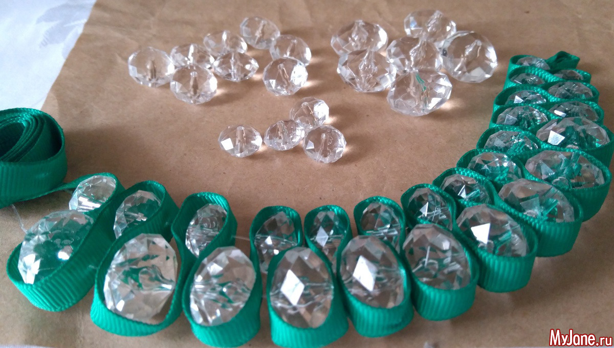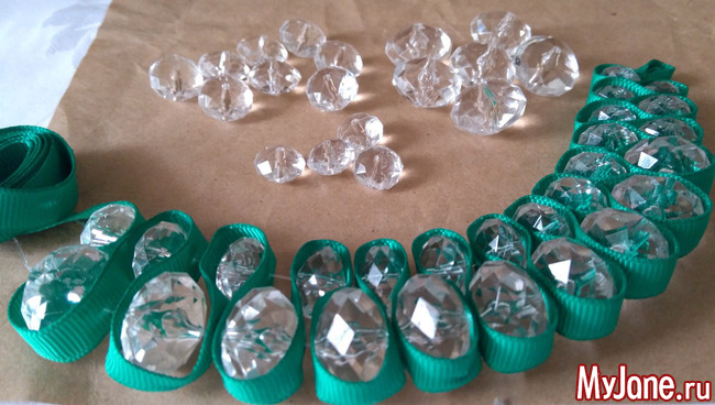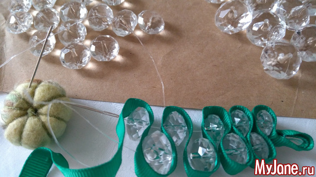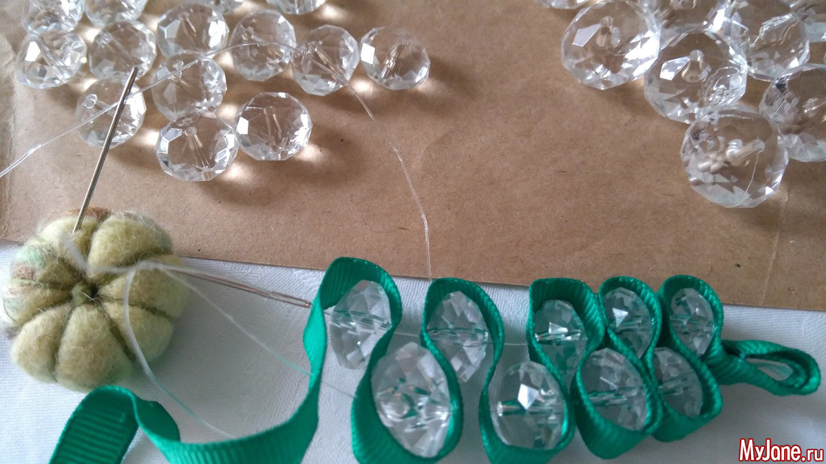 Делаем небольшую петельку из репсовой ленты и закрепляем ручными стежками иголкой с вставленной ниткой или леской. Заправленные иголки нужны сразу две, так как сшивать бусины будем параллельно в два ряда, как бы заворачивая их в репсовую ленту. Сквозь петельку делаем первый прокол иглой и нанизываем бусину минимального размера, огибая её репсовой лентой с другой стороны.Это будет самая первая бусина верхнего ряда.