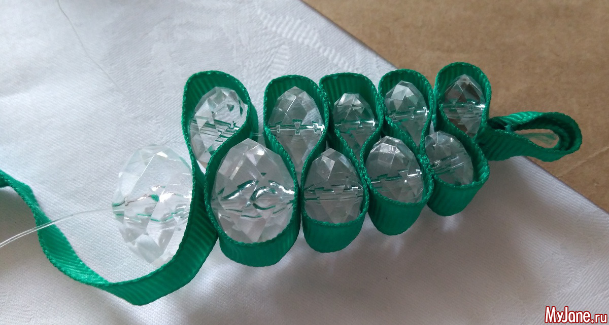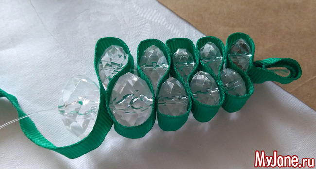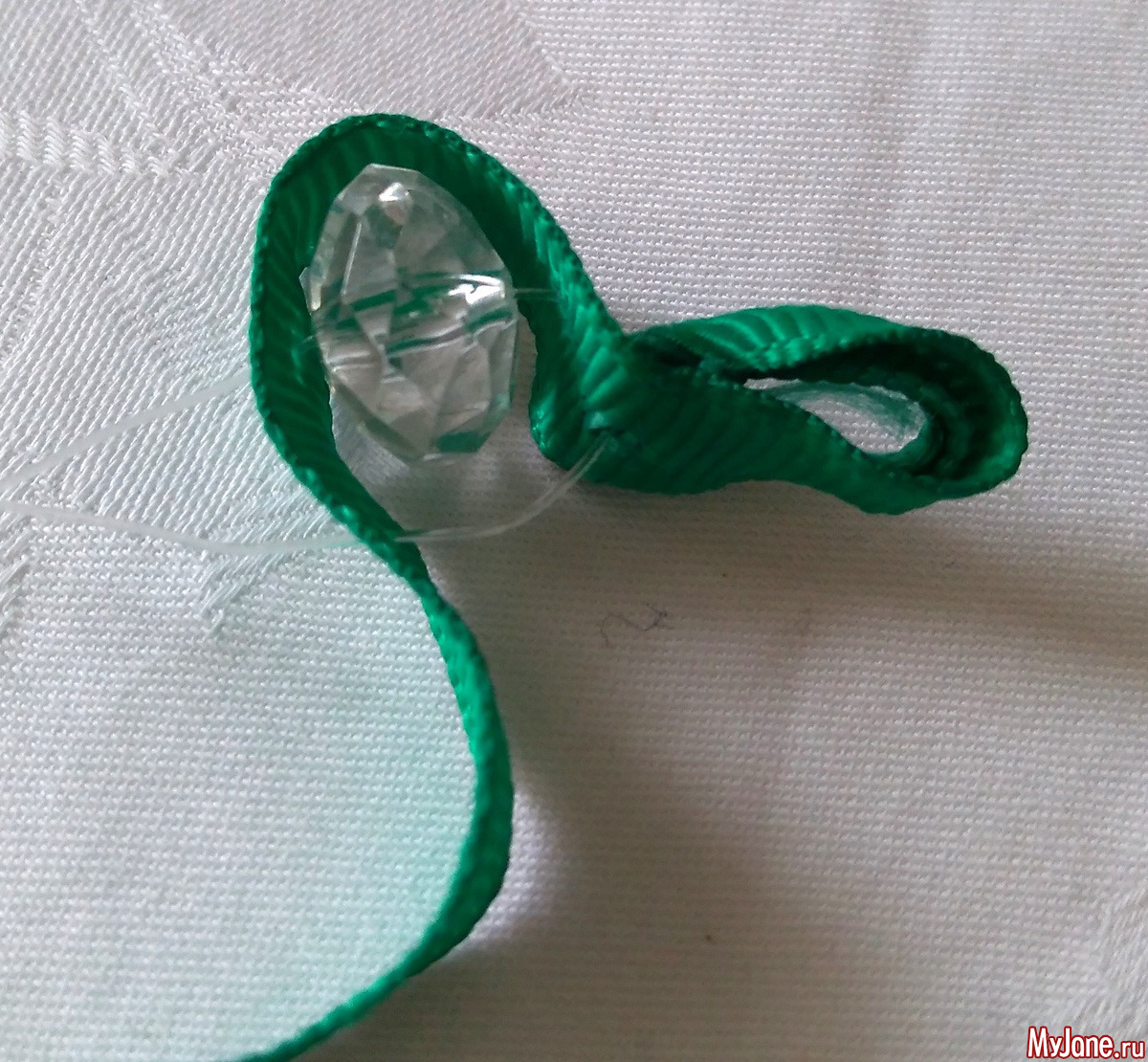 Делаем петлю лентой и в нижнем ряду вставляем ещё одну бусину, которую закрепляем другой иглой сквозь отверстие бусины, прихватывая репсовую ленту с обеих сторон.