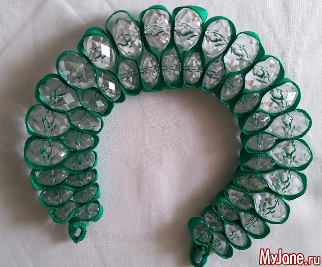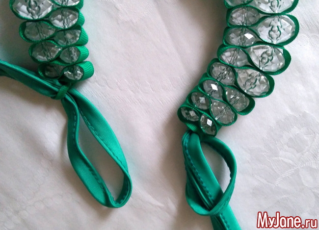 Основа ожерелья готова, прикрепляем завязки. Для этого подготовленные шнурки вставляем в петельки из репсовой ленты, как видно на фото и закрепляем.