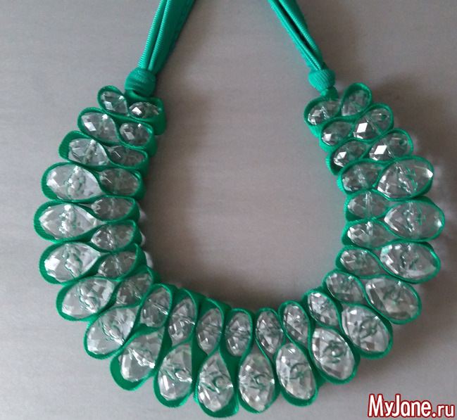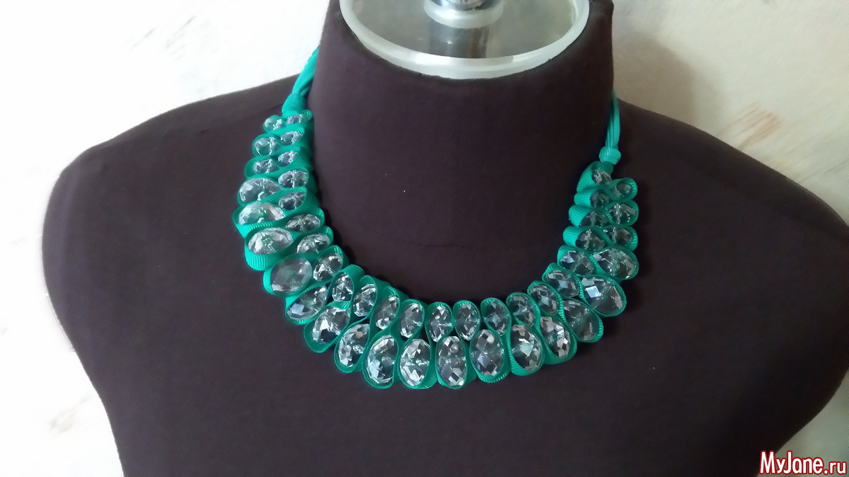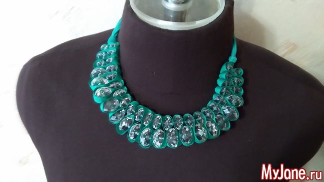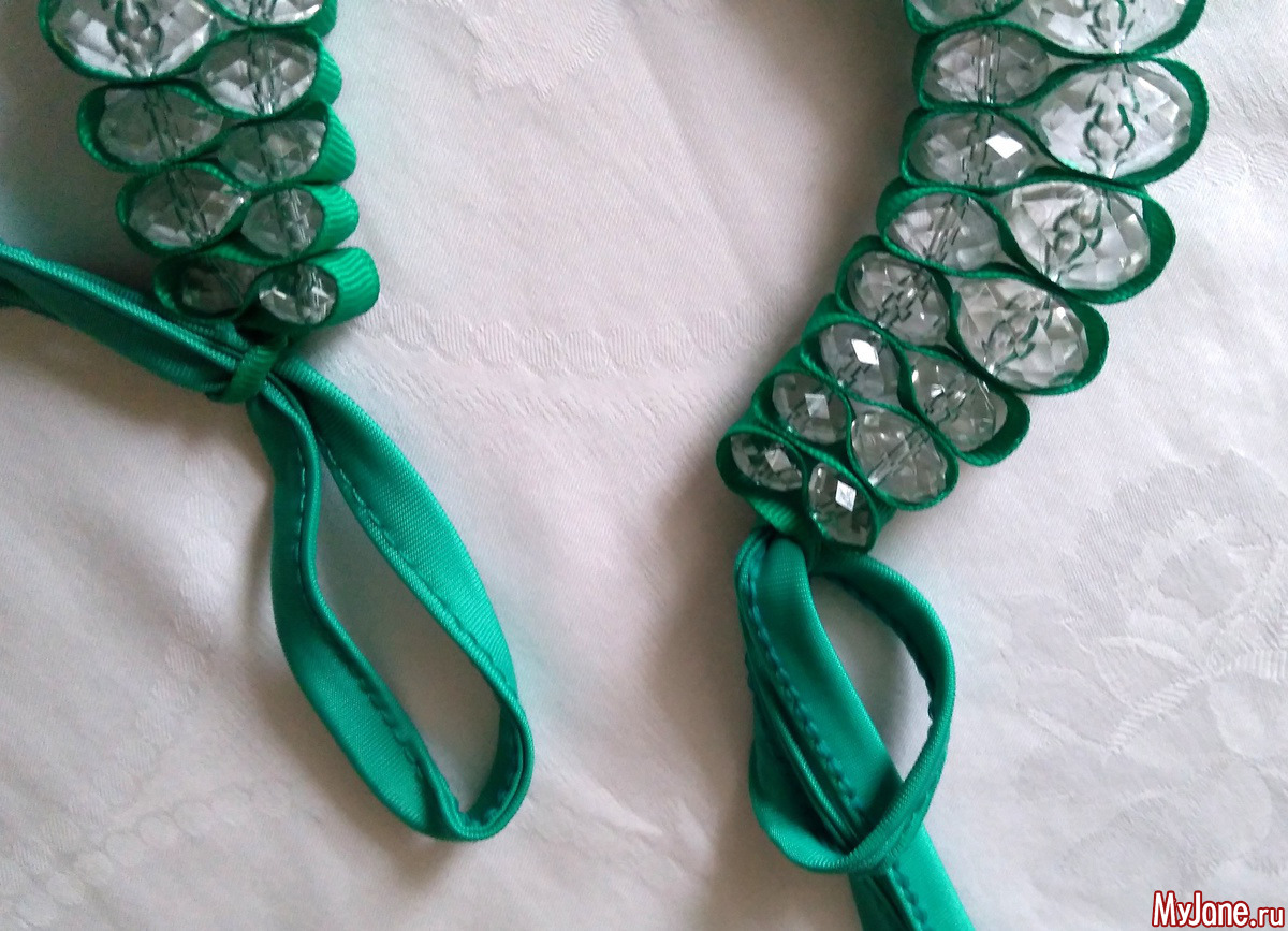 А ещё как вариант дальнейшего применения ожерелья – закрепить его спереди на вырез горловины сарафана или топа с открытой спиной, а завязки вокруг шеи будут поддерживать лиф одежды.
