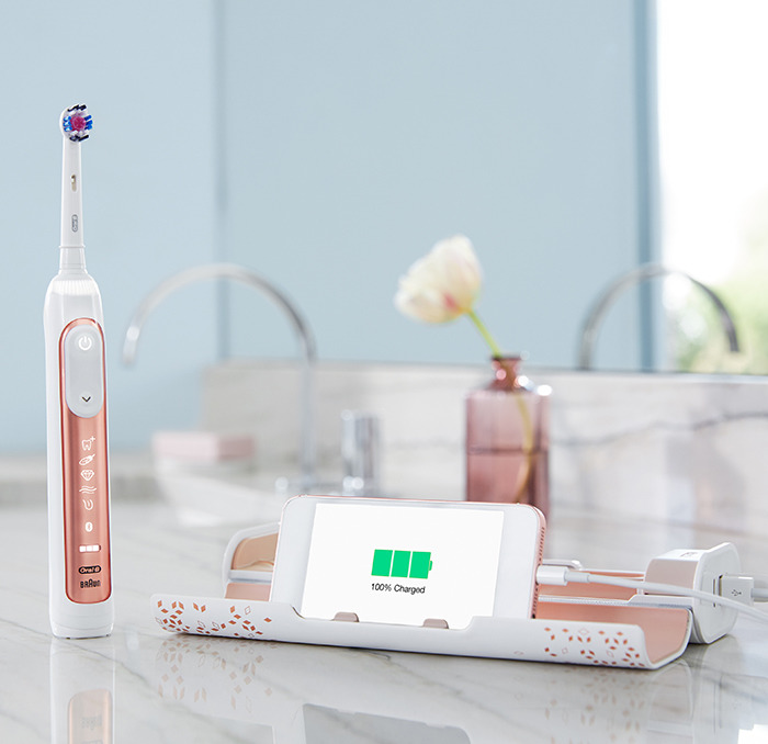 Oral-B GENIUS Rose Gold поставляется в комплекте с дорожным футляром, который параллельно выполняет функцию зарядного устройства.