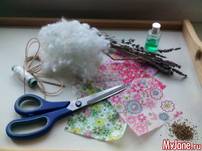 Итак, что нам нужно. Самый главный атрибут – это кусочки разноцветной ткани. Желательно, чтоб это был хлопок, сатин или лён – одним словом, простая, не атласная или шелковая. Объясню почему. В бутоны, кроме наполнителя, я добавила сушеные травы, а для ароматизации помещения, лучше всего «проводником» для этого служит именно простая ткань. Следующими подручными элементами служат: