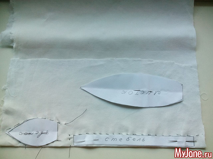 На бумаге рисуем детали букета – листок, цветок и стебель. Здесь нужно учесть, что на припуски нужно будет добавить по краю сантиметр для того, чтоб удобно было всё сшивать.